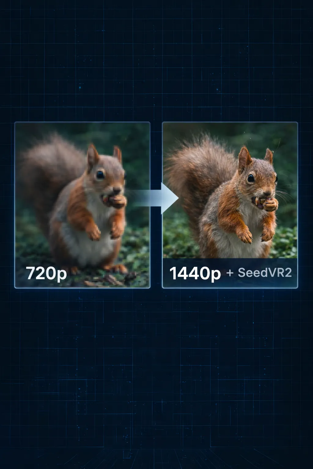 SeedVR2 adds genuine detail that wasn't visible before. A 1280×720 source becomes a true 2560×1440 output — sharper text, cleaner edges, recovered textures.